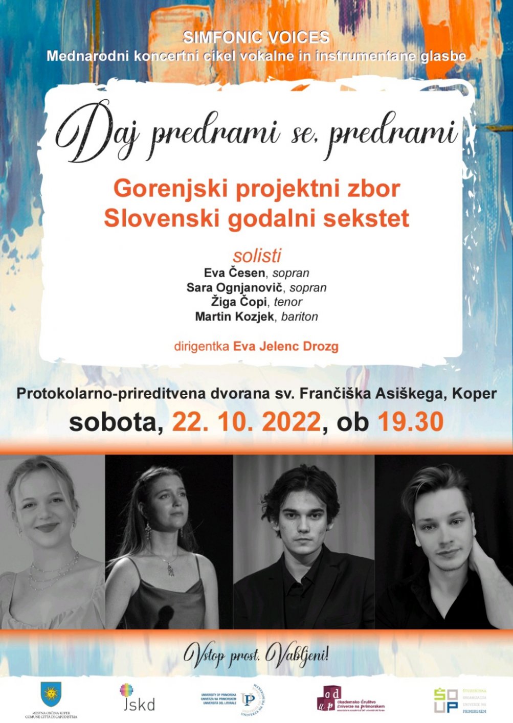 V soboto, 22. oktobra 2022 ob 19.30, bo v dvorani Sv. Frančiška Asiškega v Kopru ponovno zazvenel vokalno-instrumentalni koncert. Sooblikovali ga bodo pevski solisti (Eva Česen - sopran, Sara Ognjanovič - sopran, Žiga Čopi - tenor, Martin Kozjek – bariton), Slovenski godalni sekstet (Tim Skalar Demšar (violina) k.g., Vid Sajovic (violina), Nejc Mikolič (viola), Katarina Kozjek (violončelo), Miha Firšt (kontrabas) k.g, Mateja Jelenc Arnšek – klavir, orgle) ter Gorenjski projektni zbor pod vodstvom dirigentke Eve Jelenc Drozg.