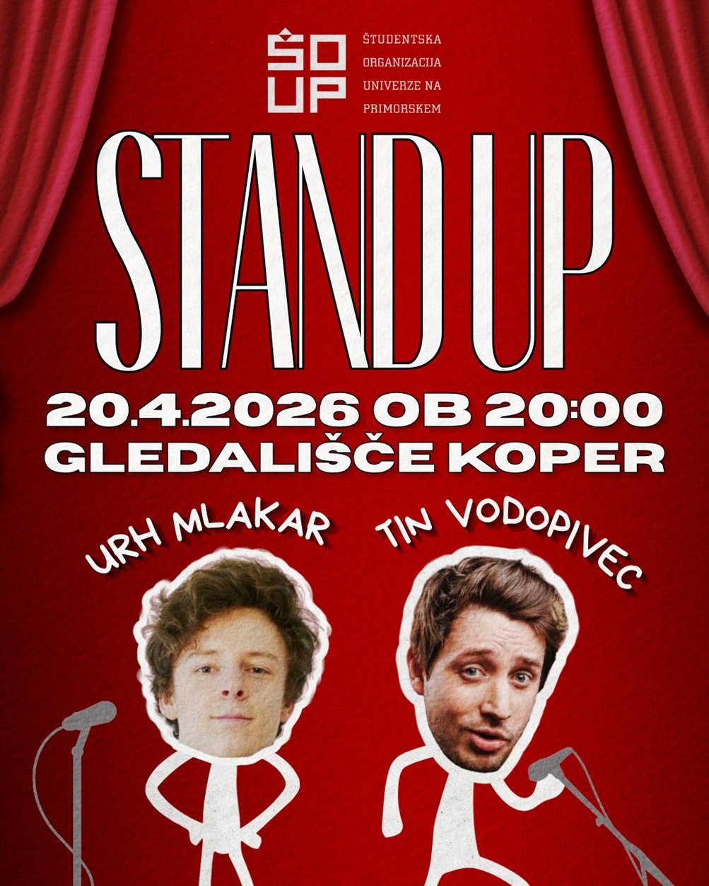V tem duhu bo Gledališče Koper v ponedeljek, 20. aprila 2026, ob 20.00 odprlo vrata študentom s Študentskim Stand Up Večerom, ki bo obenem otvoril Kulturni teden ŠOUP.Na odru bosta moči združila stand up komik Tin Vodopivec in glasbenik ter freestyle raper Urh Mlakar. Skupaj pripravljata poseben večer komedije in glasbe, ki prinaša humor, prepoznavne situacije iz vsakdanjega življenja ter sproščeno energijo, zaradi katere njuni nastopi vedno pritegnejo občinstvo. Študentom je obisk dogodka omogočen brezplačno, vendar je obvezna prijava in rezervacija vstopnice. Pri prijavi je potrebno navesti vpisno številko, saj se bo na vhodu preverjala študentska izkaznica.