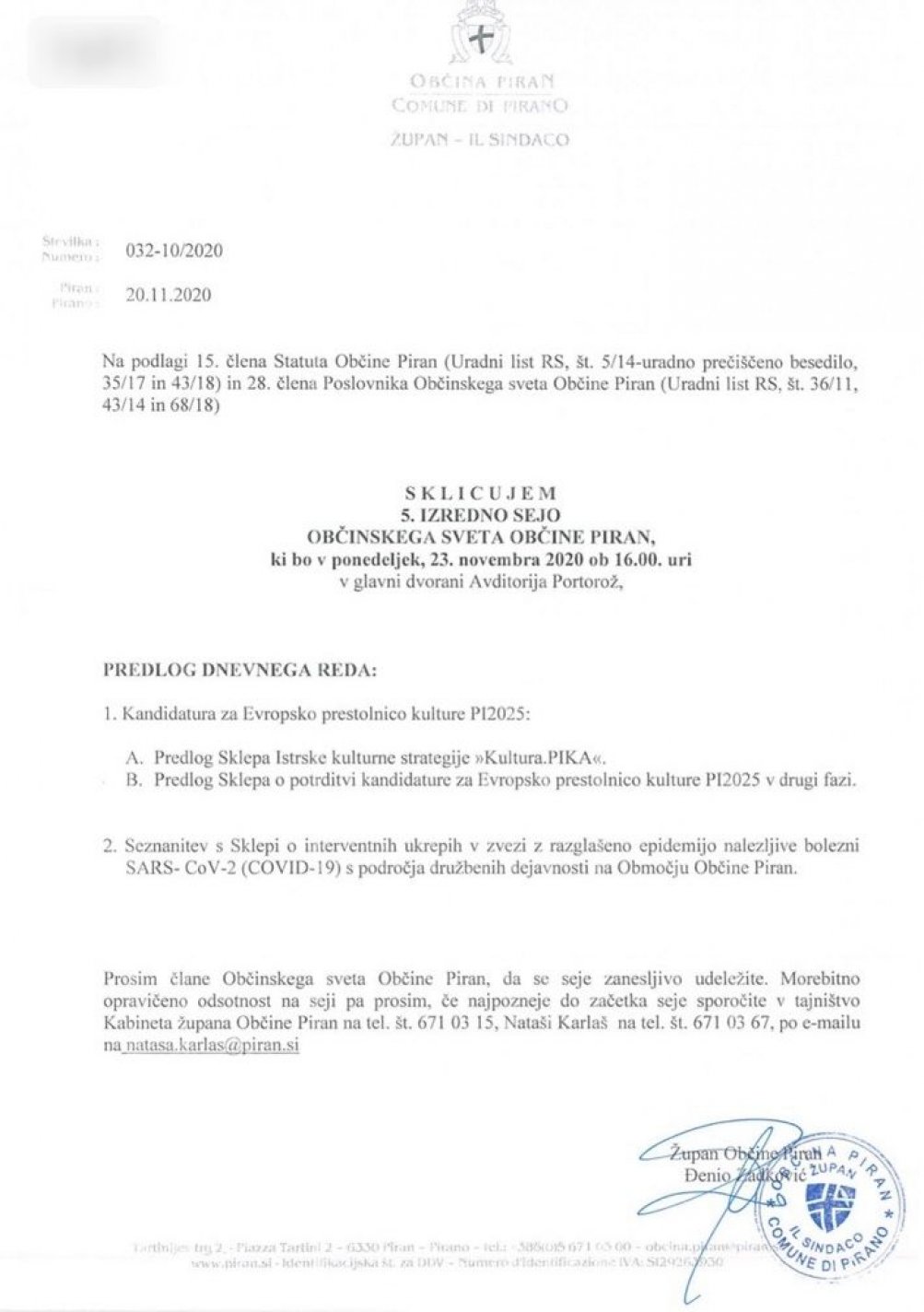 Po včerajšnji burni seji piranskega občinskega sveta, ki se je končala po uri in pol, so iz piranske občine danes sporočili, da je naslednja izredna seja sklicana za ponedeljek, 23. novembra. Piranski župan Đenio Zadković je deležen ostrih očitkov, da vso pozornost namenja kandidaturi Pirana za Evropsko prestolnico kulture (EPK) 2025, medtem ko se nahajamo sredi socialne, ekonomske in tudi družbene krize, povzročene zaradi epidemije covid-19. Svetniki iz vrst SD mu očitajo pritiske, naj na vsak način podprejo kulturno strategijo istrskih občin in potrditev kandidature. "Kulturno strategijo Kultura.PIKA smo pogledali od blizu z vsemi finančnimi posledicami. Zaradi koronavirusa je še posebej težko leto in skrb bi bila primarno potrebna za občane," so sporočili iz svetniške skupine SD.