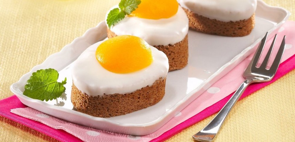 Osnova je na rezine narezana rulada, ki jo s pomočjo sladkornega preliva in vloženih marelic spremenimo v prikupna čokoladna jajčka na oko.