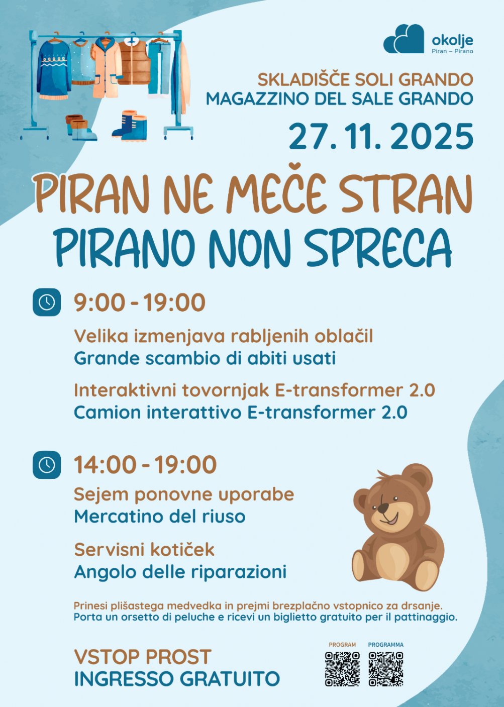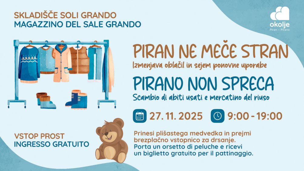 Javno podjetje Okolje Piran bo letošnji Evropski teden zmanjševanja odpadkov obeležilo z dogodkom 'Piran ne meče stran', ki bo v četrtek potekal v nekdanjem skladišču soli Grando. Namen dogodka je spodbujanje ponovne uporabe, zmanjševanje tekstilnih odpadkov ter ozaveščanje o trajnostni in odgovorni potrošnji.