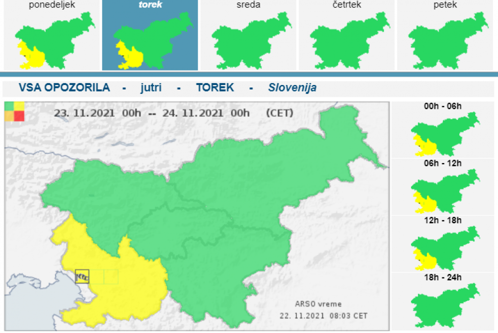 Ponoči bo oblačno, občasno bo rahlo deževalo. Na Primorskem bo pihala šibka do zmerna burja. Najnižje jutranje temperature bodo 1 do 4, na Primorskem do 8, v alpskih dolinah okoli -2 stopinje Celzija. V torek dopoldne se bo delno zjasnilo. Ponekod bo pihal severovzhodnik, na Primorskem šibka do zmerna burja. Najvišje dnevne temperature bodo od 4 do 8, na Primorskem do 13 stopinj Celzija, piše na spletni strani Arsa.