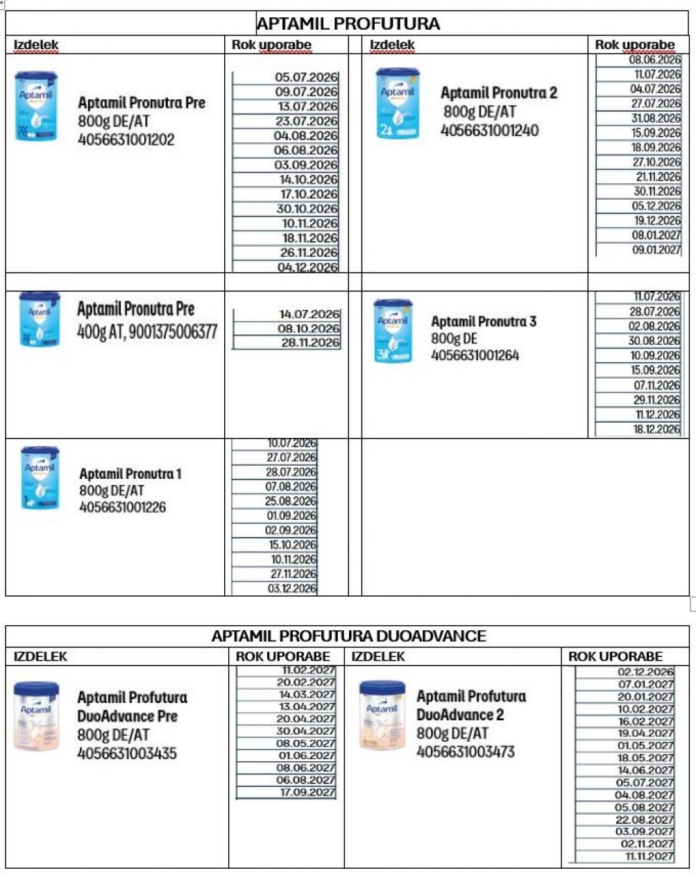 Serijska oznaka začetne formule za dojenčke Aptamil pronutra pre je 4056631001202, Aptamil pronutra advance pre 9001375006377, Aptamil pronutra 1 4056631001226, Aptamil pronutra 2 4056631001240, Aptamil pronutra 3 4056631001264, Aptamil profutura DuoAdvance pre 4056631003473 in Aptamil profutura DuoAdvance 2 4056631003473.