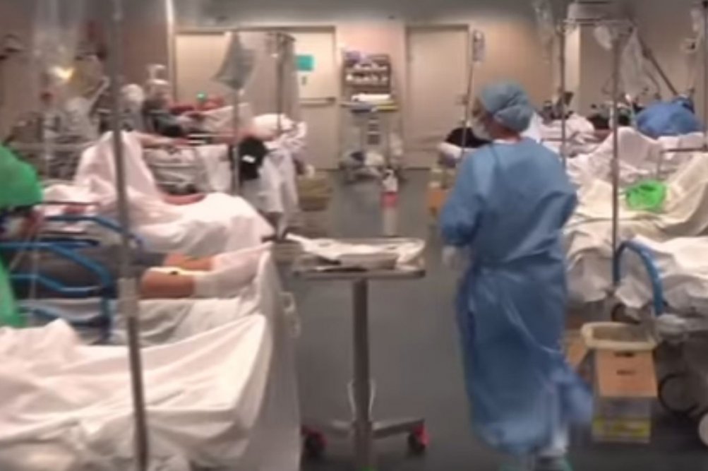 Videoposnetek prikazuje bolnišnične oddelke in hodnike, prepredene s posteljami. Bolniki se držijo za prsni koš in težko dihajo s pomočjo respiratorja. Zdravniki in medicinske sestre naglo krožijo med bolniki in jim skušajo pomagati, kolikor lahko.