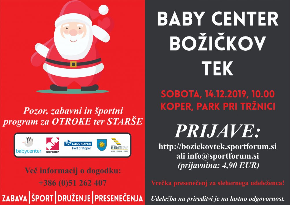 Za prijave in dodatne informacije se obrnite na elektronski naslov info@sportforum.si ali na telefonsko številko 051 262 407. Prijave so možne do sobote do 9. ure. Prijavnina na dogodek znaša 4,90 evra, vsakega udeleženca pa bo Božiček tudi obdaril s kopico presenečenj.