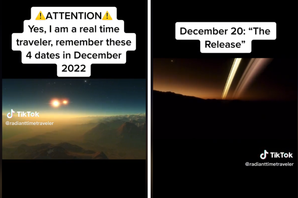 Samooklicani popotnik skozi čas zatrjuje, da se bo jutri, 20. decembra, zgodilo nekaj zelo velikega, dogodek imenovan 'The Release' oziroma 'sprostitev'. Eno Alaric v svoji najnovejši objavi na TikToku pravi, da si je potrebno v mesecu decembru 2022 zapomniti štiri datume.